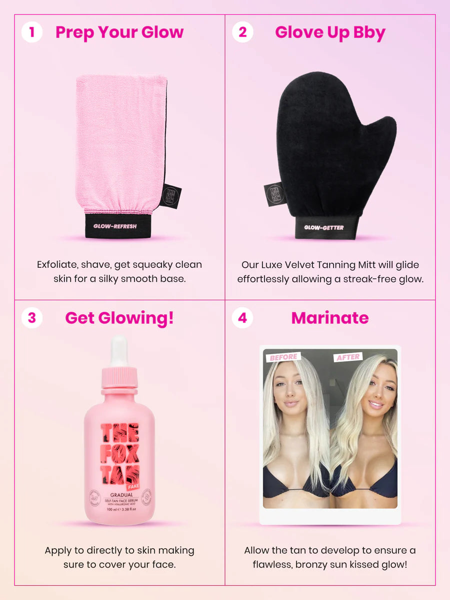 Simply apply the drops directly to your face and massage into skin. We best recommend the Gradual Self-Tan Face Serum be applied after cleansing in the PM.